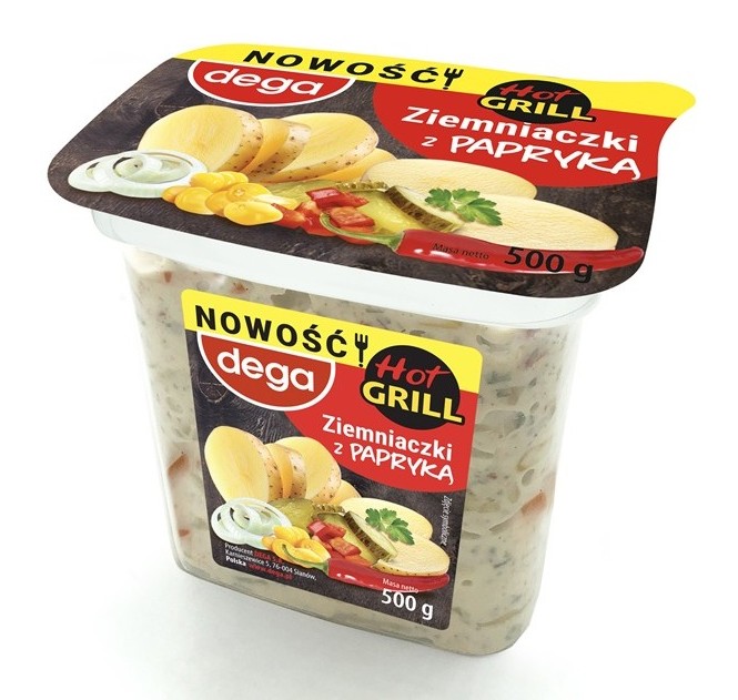 Sałatka z ziemniakami 54 % z papryka chili 0,18 %. Główne składniki: ziemniaki, olej rzepakowy, woda, papryka 5 %, cukier, cebula 3 %, kukurydza 3 %, ogórek 3 %, ocet spirytusowy, sól, przyprawy (zawierają gorczyce), żółtko jaja* w proszku, papryka chili, substancje konserwujące: benzoesan sodu, sorbinian potasu; regulatory kwasowości: kwas mlekowy, kwas octowy; skrobia modyfikowana, śmietana w proszku (z mleka); ekstrakt kopru.