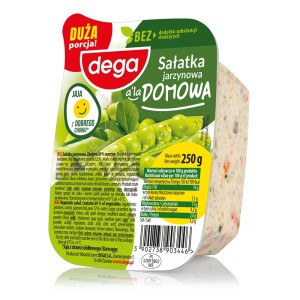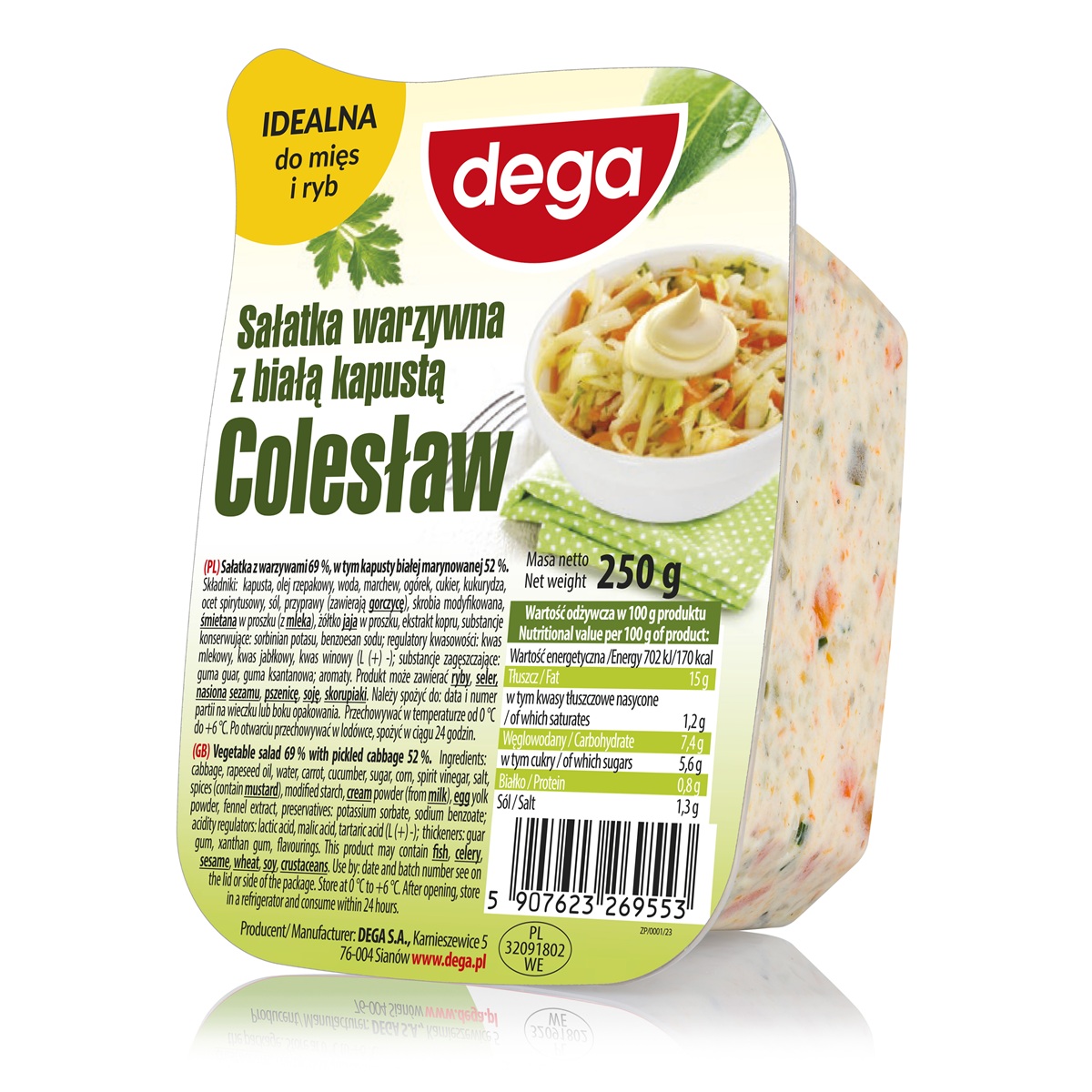 Sałatka z warzywami 69 %, w tym kapusty białej marynowanej 52 %. Główne składniki: kapusta, olej rzepakowy, woda, marchew, ogórek, cukier, kukurydza, ocet spirytusowy, sól, przyprawy (zawierają gorczycę), skrobia modyfikowana, śmietana w proszku (z mleka), żółtko jaja w proszku, ekstrakt kopru, substancje konserwujące: sorbinian potasu, benzoesan sodu; regulatory kwasowości: kwas mlekowy, kwas jabłkowy, kwas winowy (L (+) -); aromaty.